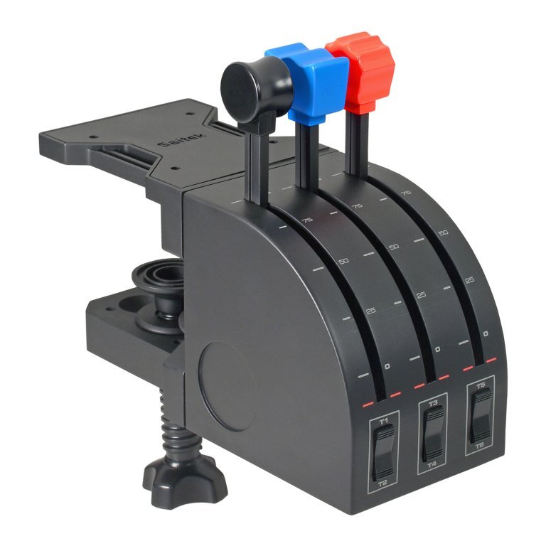 Игровая периферия Pro Flight Throttle Quadrant представляет собой блок, который можно с помощью струбцин, удобно расположить на рабочем столе. Данный предмет оснащен тремя рукоятками - для газа, для шага винта, а также имеет комбинированную рукоятку. В комплект коробки входят дополнительные переключатели режимов и ручки для улучшения конфигурации. Питание интерфейса осуществляет USBпорт. Коробка передач включает в себя мощную технологию программирования - Saitek (R) Smart. Такое программное обеспечение позволяет задавать всем управляющим элементам те настройки, которые подходят индивидуально игровому стилю геймера.